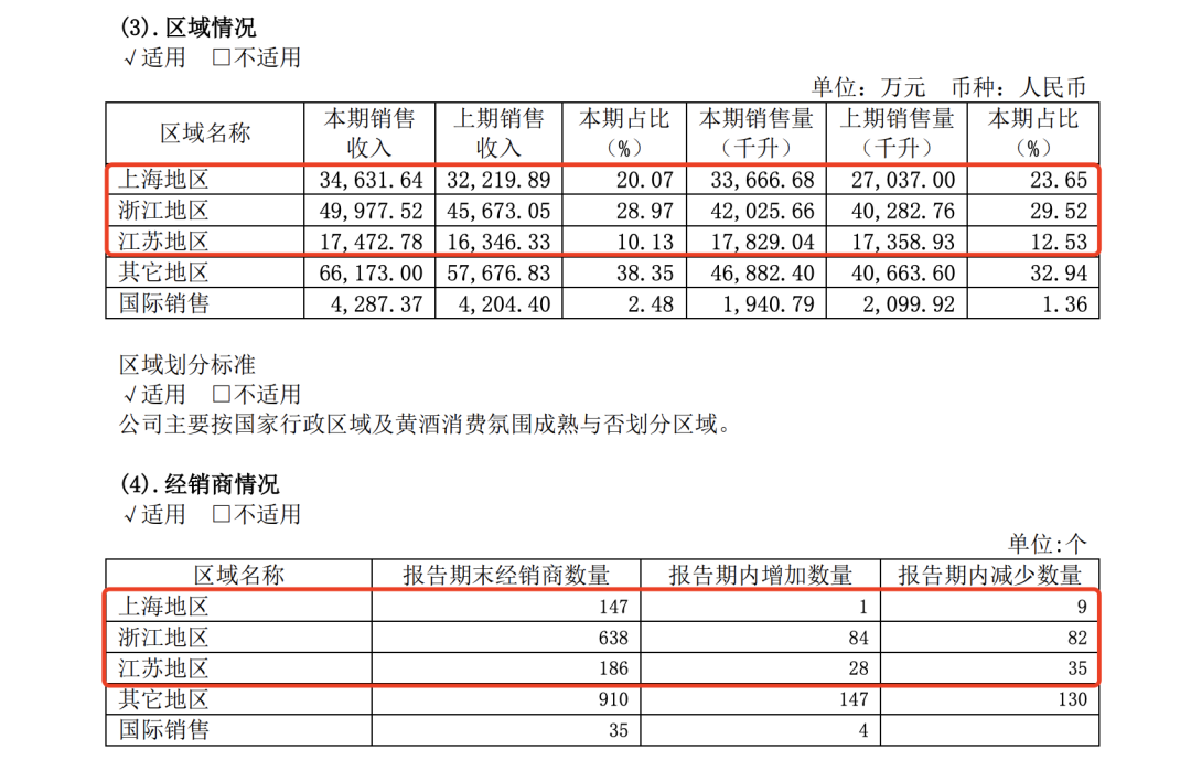 雪上加霜的是,在困于区域的背景下,古越龙山极度依赖的江浙沪地区,发展也在减速。2023年古越龙山江浙沪合计销量占比为65.7%,较2022年的66.44%有所下降;同期,江浙沪经销商共有971家,同比减少了13家,其中上海和江苏的经销商数量都在下降。