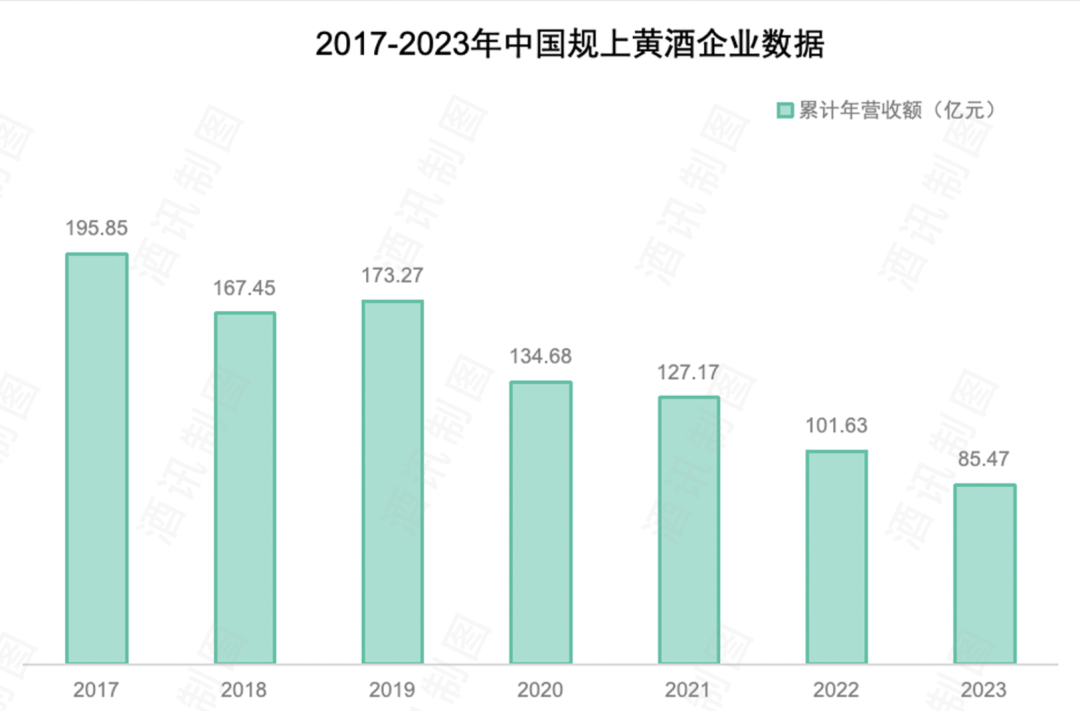 据中国酒业协会数据,目前黄酒占酒类市场总量不到2%。2023年,规模以上黄酒企业累计营收为85.47亿元。行业整体营收规模从2017年的195.85亿元,逐渐下降至2023年的85.47亿元,六年复合增长率下滑12.91%,企业数量也从2017年的121家下降至2023年的81家。