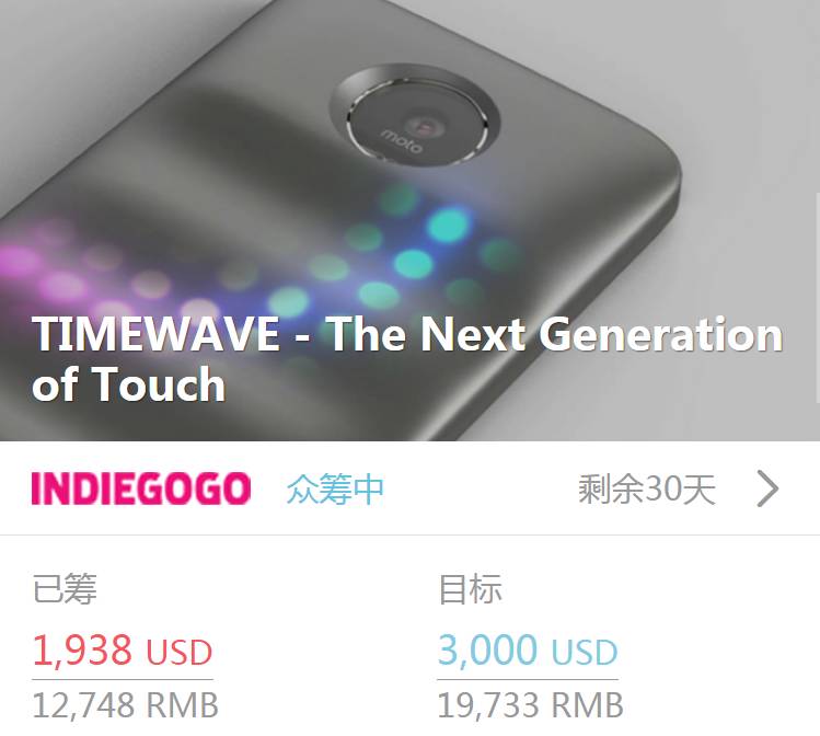 最近一款叫做 Timewave 扩展模块,入围了由摩托罗拉和 Indiegogo 等联合举办的主题「 改变智能手机」创意产品决赛,现正在 Indiegogo 众筹。上线两天,获得 26 人支持,共筹得 12,748 RMB,现在目标达成率 64.6%.