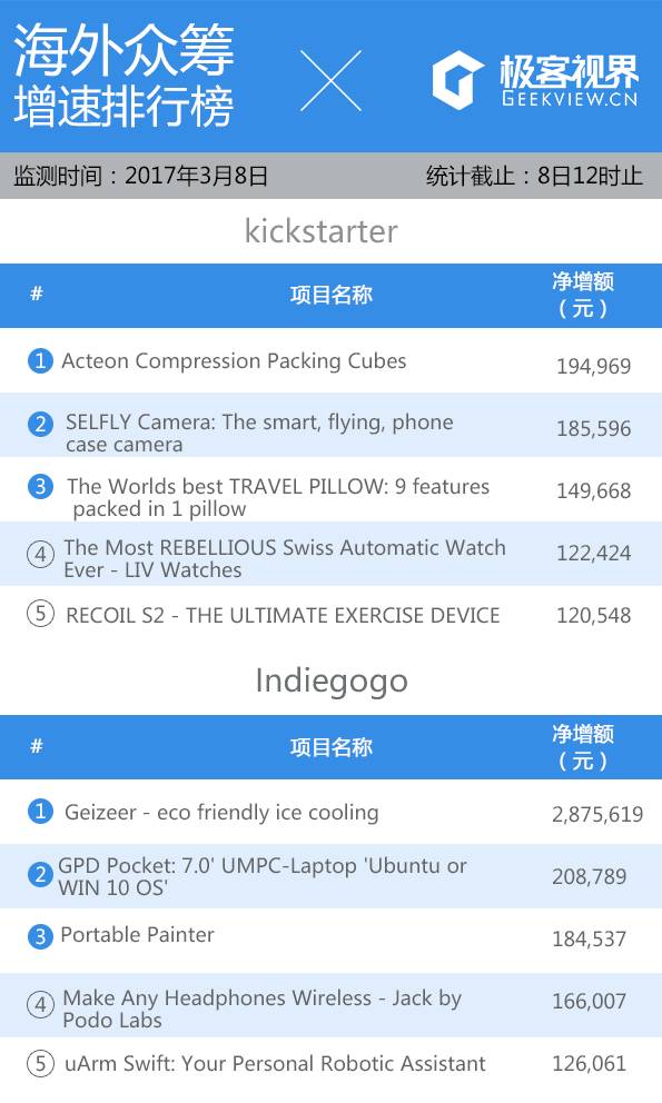 今天 Kickstarter 前几名都是一些创意产品,其中第三名的 H 型旅行颈枕,今天共筹得 149,668 RMB,目标达成率 1,484%.