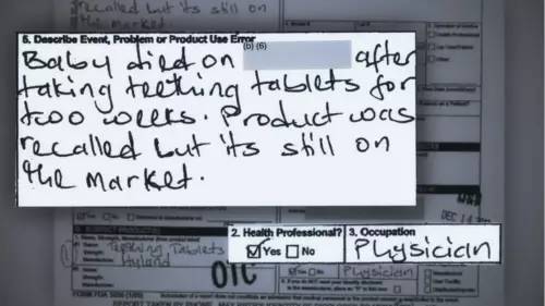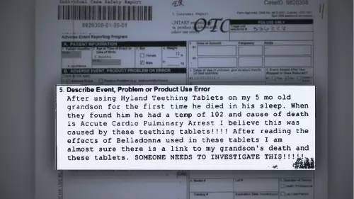 在2011年9月15日的编号462749案例中,一位医生递交了自己关于Hyland’s药品的手书笔记,表明他的一个5个月大的女婴患儿在服用Hyland’s的出牙药片后陷入了长达45分钟的昏迷。