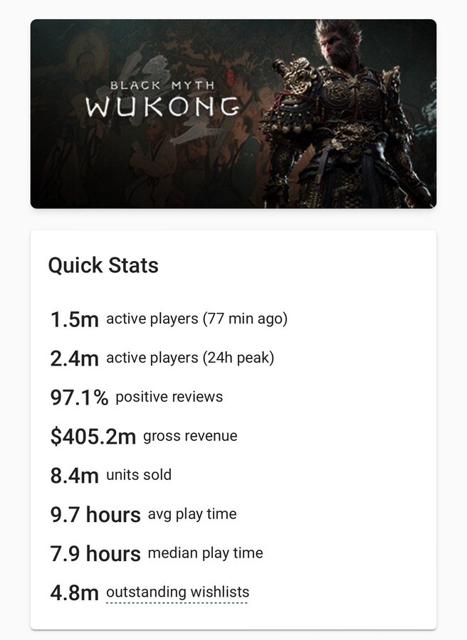 国外市场研究公司vginsights的预估数据显示,《黑神话:悟空》自发售以来,三天内在Steam平台的销量已突破840万份,好评率超97%,平均游戏时间9.7小时,同时在线玩家数超240万,总收入超过4亿美元。