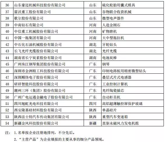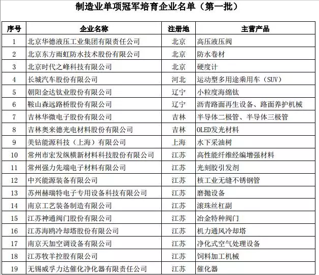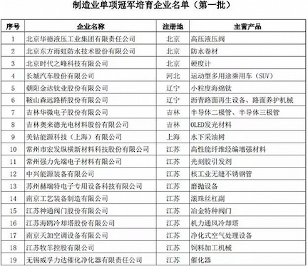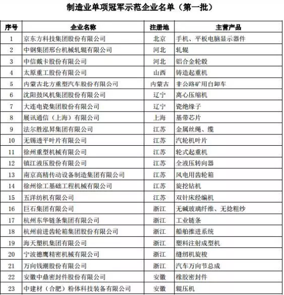2017年1月17日,工业和信息化部、 中国工业经济联合会公布了第一批制造业单项冠军示范(培育)企业名单。文件明确指出各地工业和信息化主管部门、工业经济联合会,有关行业协会要加强对企业的指导和服务,引导和支持企业专注于细分产品领域的创新、产品质量提升和品牌培育,提升国际知名度与竞争力。示范企业要积极采取措施,进一步巩固其全球地位;培育企业要落实其培育发展方案,力争尽早发展成为全球领先企业。