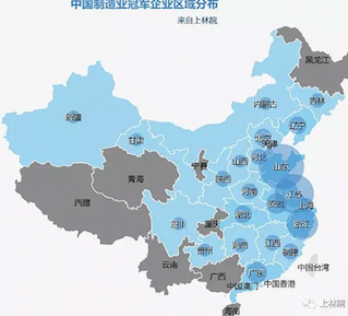 在中国制造业冠军企业区域分布图中,灰色地区未有企业入围冠军企业,共计9省区,包括广西、云南、黑龙江、重庆、天津、海南、宁夏、青海、西藏等地,除黑龙江、宁夏外主要分布在西南地区。有入围企业的省市在图中用圆圈大小表示冠军企业数量,山东、江苏、浙江以22家、18家、13家占据三甲位置,广东、安徽各有6家企业入选。入选4家企业的有湖北、辽宁、北京。河南、陕西、河北、福建、江西以3家企业紧随其后。上海、湖南、吉林各有两家企业入选。有一家冠军企业的有内蒙古、四川、山西、新疆、甘肃、贵州。