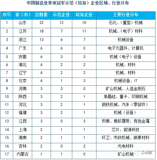 在冠军企业最多的三个省份中。山东 22 家企业入围,其中示范企业12家,培育企业10家,占总数的21.2 %,超过总名单的1/5。江苏18 家企业入围,其中示范企业7家,培育企业11家,占总数的17.3% 。浙江13家企业入围,其中示范企业6家,培育企业7家,占总数的12.5%。