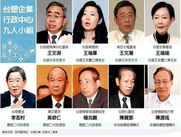 2006年,台塑对外公布接班方案,王永庆、王永在兄弟退休,将行政权交给新成立的“七人小组”。“七人小组”由王永庆三房的两位女儿王瑞华和王瑞瑜、王永在的两位儿子王文渊和王文潮,以及三位台塑元老组成。职务方面,王文渊担任集团总裁,是七人行政小组的首脑。2011年,七人小组又引进两名职业经理人,变成“九人小组”。