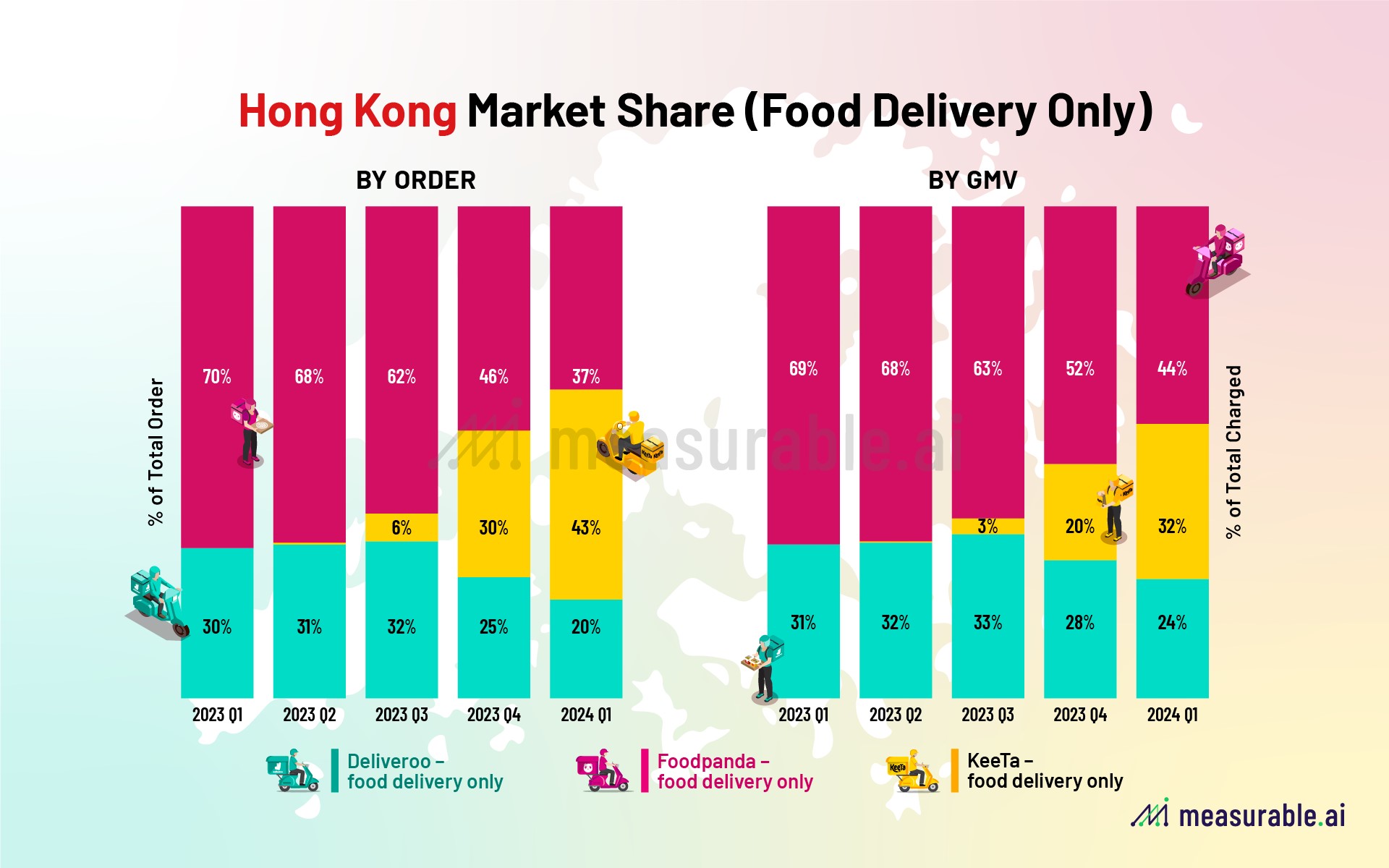 根据Measurable AI的数据,今年第一季度,按食品配送订单数量来看,Keeta在香港的市占份额已达到44%,Foodpanda为35%,Deliveroo为21%,Keeta已跃升为香港第一大外卖平台。