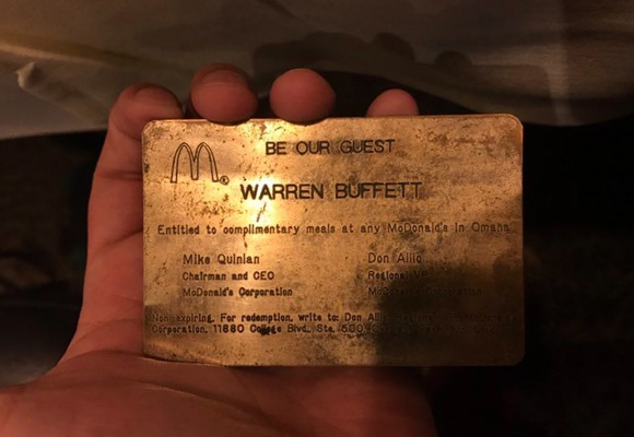 他可以拿着这张刻字的卡片终身免费享用麦当劳——但仅限于奥马哈。这太酷了。我建议他在其他地方试着用用看,也许收银员不会拒绝他。