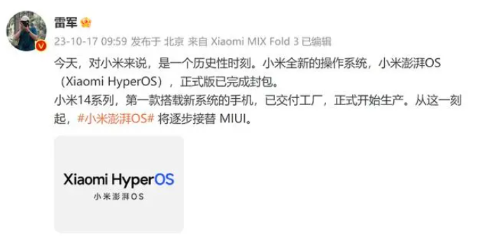2023年10月,小米发布自研手机操作系统“小米澎湃OS”;