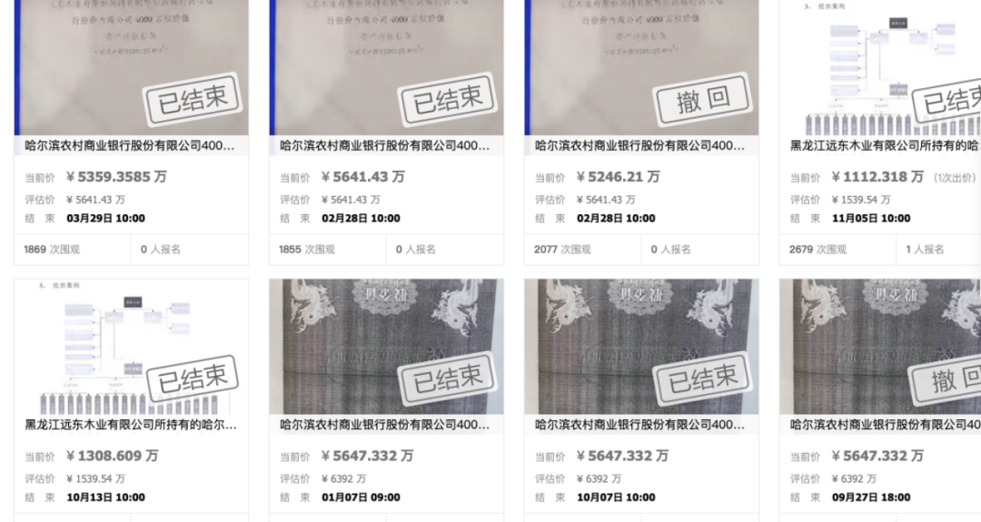 而阿里司法拍卖平台信息还显示,2019年至2022年,哈尔滨农商行第八大股东黑龙江远东木业有限公司(简称“远东木业”)7次拍卖所持该行4000万股股权,均以流拍告终。
