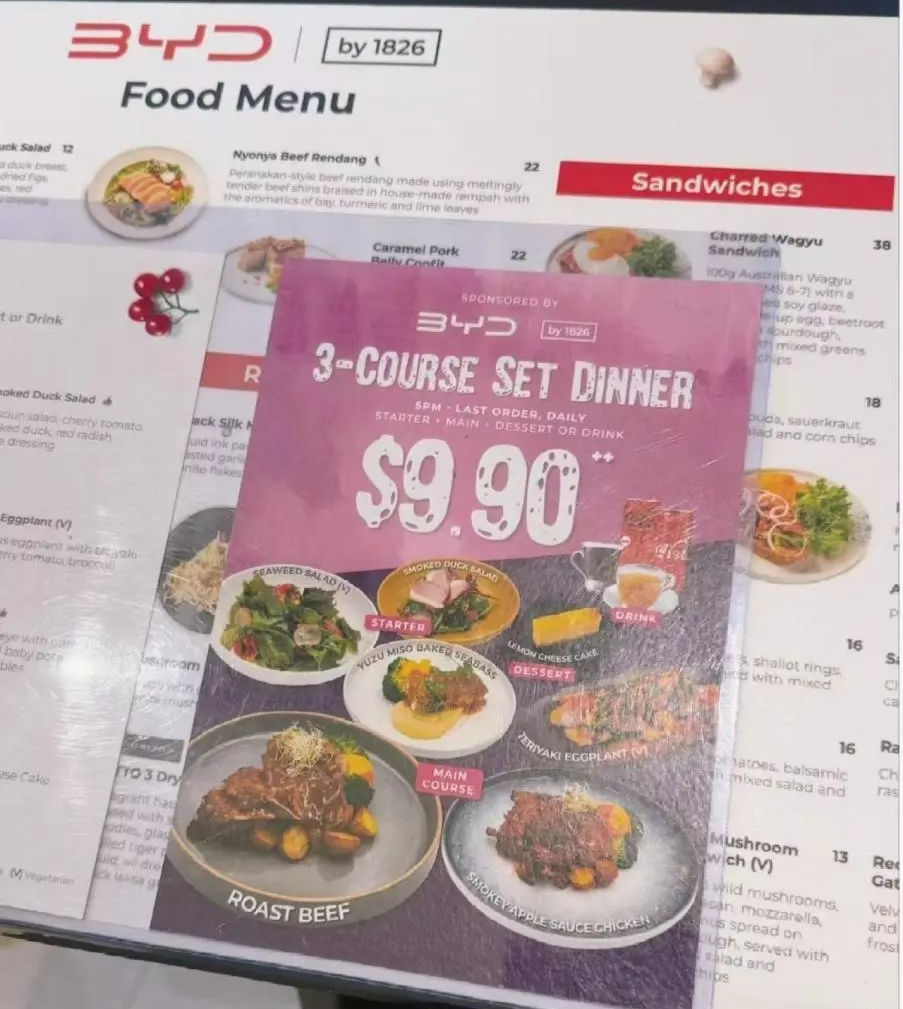 无独有偶,比亚迪还把“中式营销策略”带到新加坡。2023年8月4日,比亚迪城市展厅兼咖啡厅BYD SUNTEC正式在新加坡开业。除BYD SUNTEC外,比亚迪还在新加坡开设了三家全新的比亚迪品牌餐厅,分别位于丹戎巴葛、马里士他和山景,由BYD by 1826进行管理。