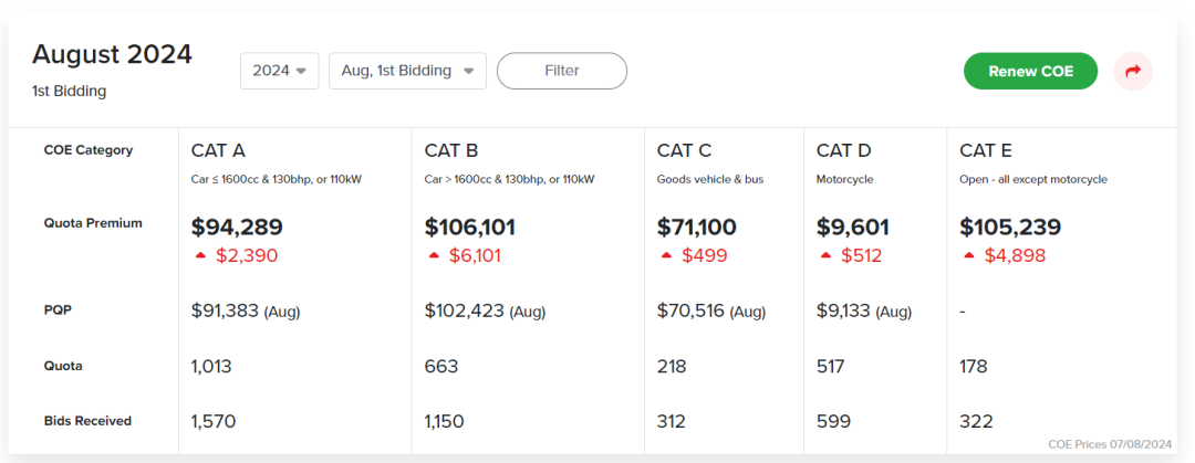 如今这张证的价格,可以用令人咋舌来形容。今年4月,大型及豪华车组和公开组的拥车证价格,已经突破10万新元(约合人民币54万),最高价18万新元(约合人民币97万)。而最新的数据显示,8月份豪华车组(CAT B)的拥车证第一轮招标价再次上涨,已来到106101新元,不夸张的说,单是一张拥车证的价格就足以在国内买一辆中档BBA了。