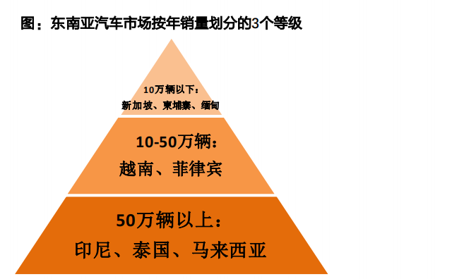 天风证券研报中,按汽车市场按年销量给东南亚划分了三个等级,其中新加坡、柬埔寨、缅甸以10万辆及以下的年销量“垫底”。