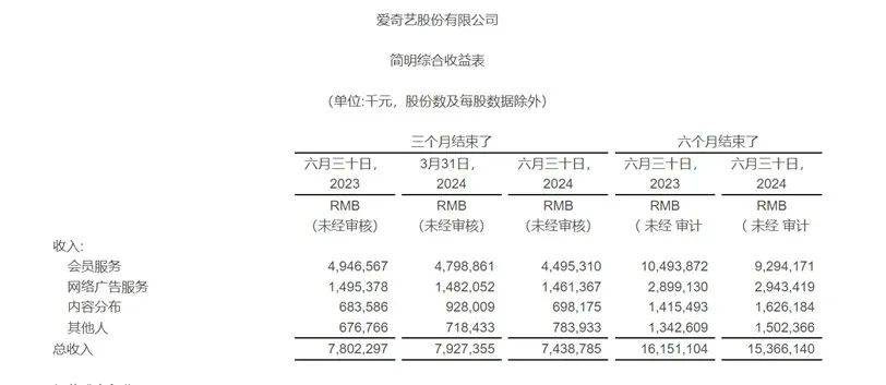 分业务板块来看,2024年第二季度,爱奇艺会员服务收入为45亿元,同比下降9%,主要由于内容板表现的波动;网络广告服务收入为15亿元,同比减少2%,主要原因是品牌广告业务减少,部分被表现型广告业务的增长所抵消;内容分发收入为6.982亿元,同比增长2%;其他收入为7.839亿元,同比增长16%,主要受人才中介服务及第三方合作收入增加的推动。