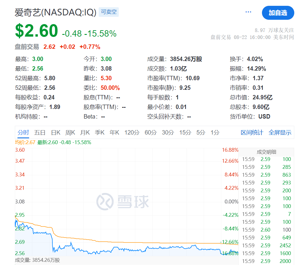 8月22日,爱奇艺发布截至2024年6月30日未经审计的第二季度财报。第二季度,爱奇艺在竞争激烈额长视频赛道上表现不及预期,公司收入同比下降,净利润大降8成。受财报影响,爱奇艺当日美股跌幅超15%。