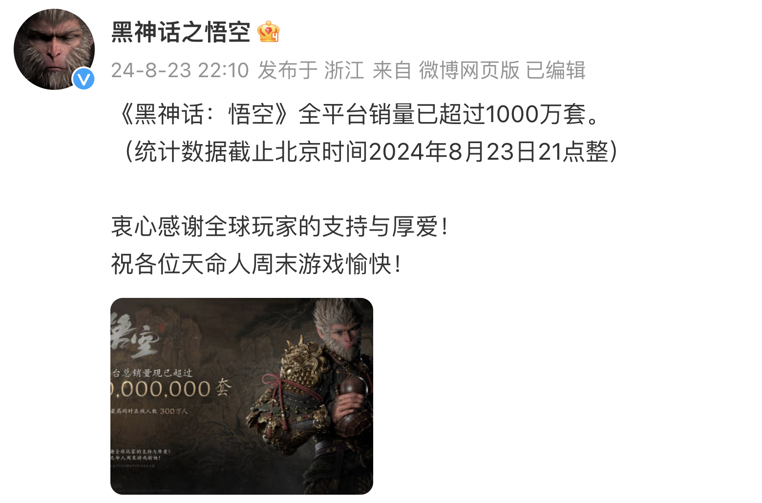 据《黑神话:悟空》官方消息,截至2024年8月23日21点整,《黑神话:悟空》全平台销量已超过1000万套,全平台最高同时在线人数300万人。
