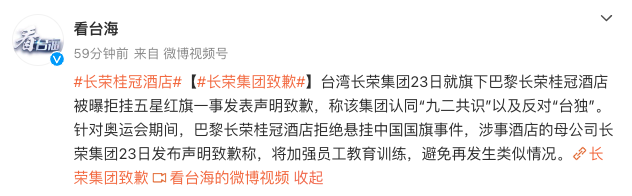 据@看台海 微博,台湾长荣集团23日就旗下巴黎长荣桂冠酒店被曝拒挂五星红旗一事发表声明致歉,称该集团认同“九二共识”以及反对“台独”。