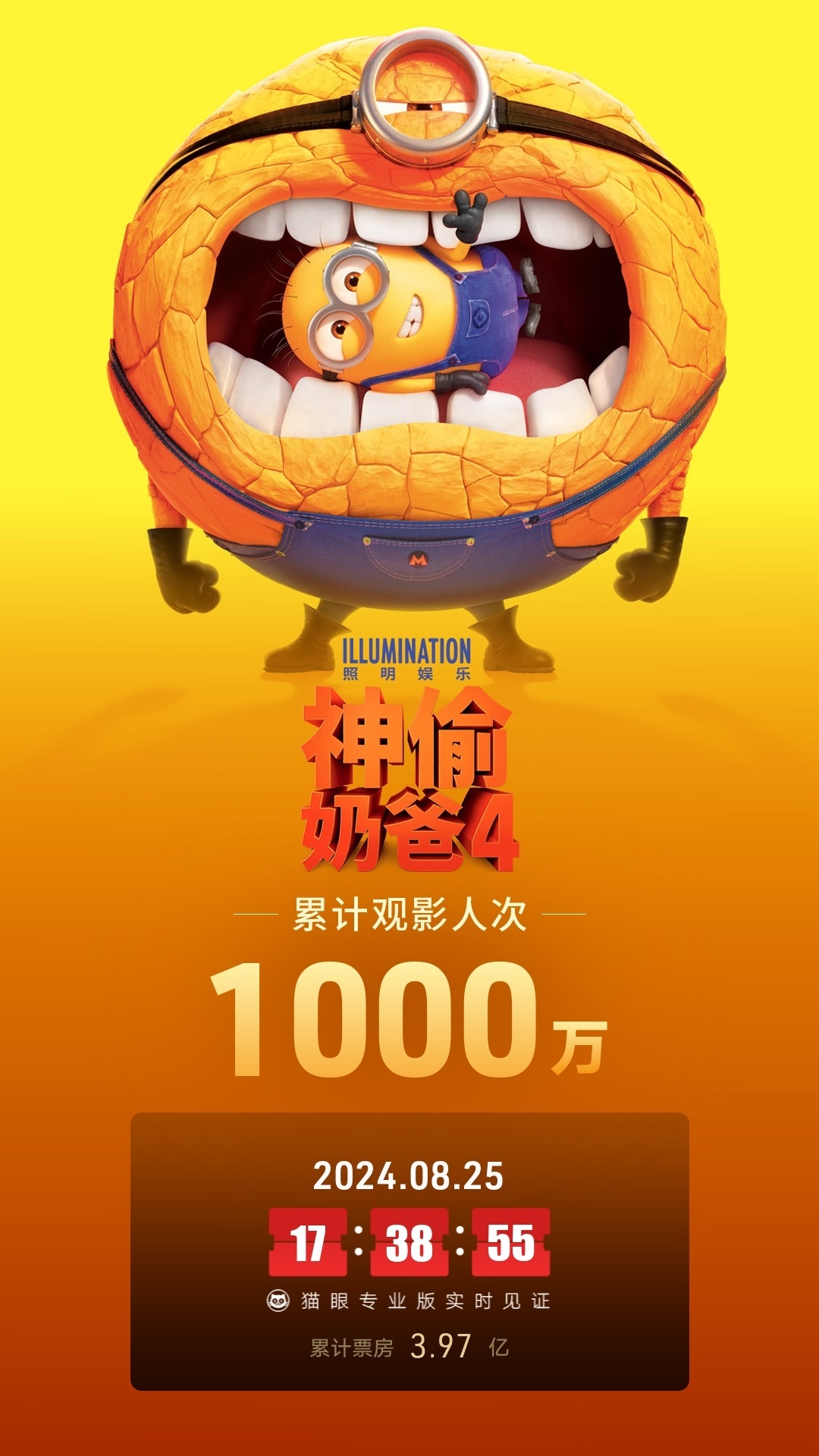 据猫眼专业版数据,电影《神偷奶爸4》上映45天,观影人次破1000万。