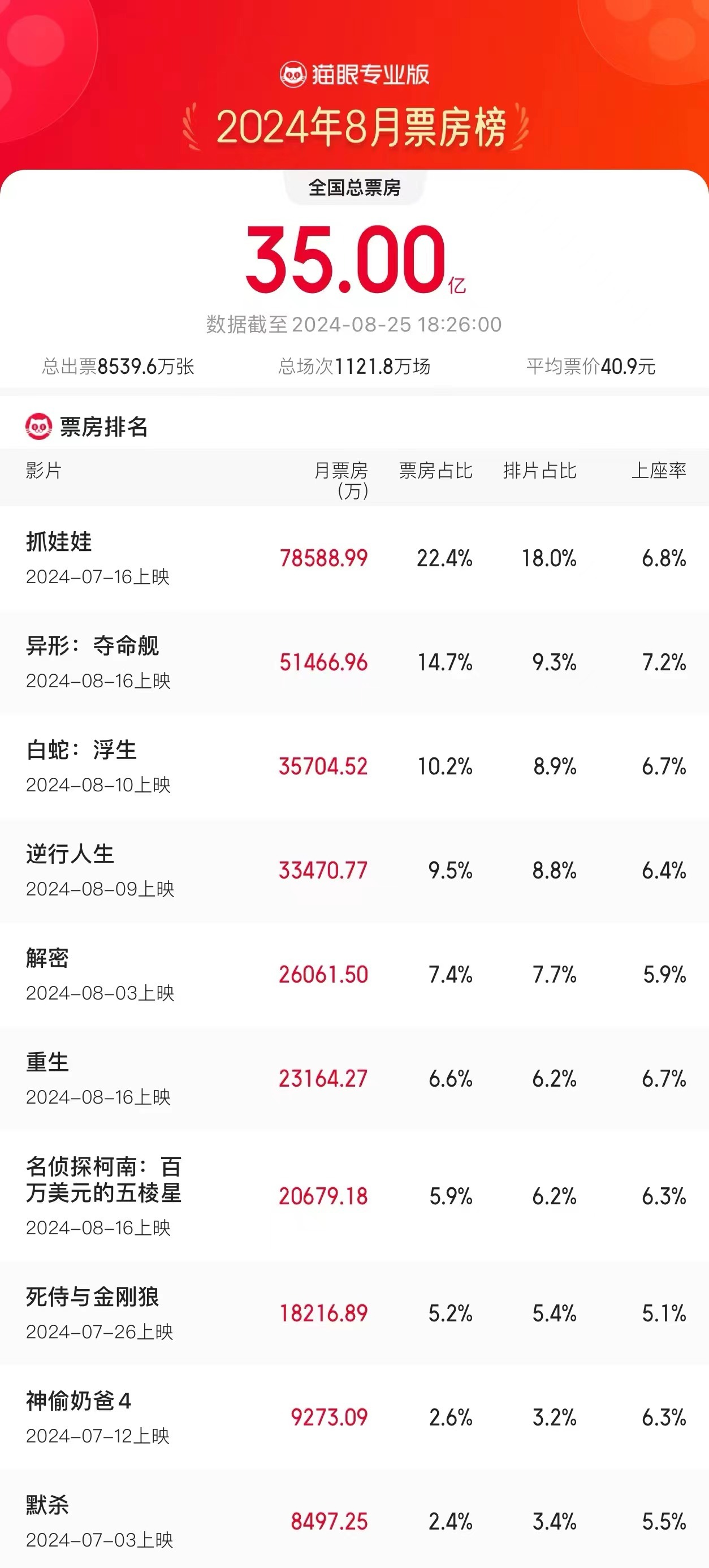 据猫眼专业版数据,8月25日18时26分,2024年8月总票房破35亿,《抓娃娃》《异形:夺命舰》《白蛇:浮生》分列8月票房榜前三位。