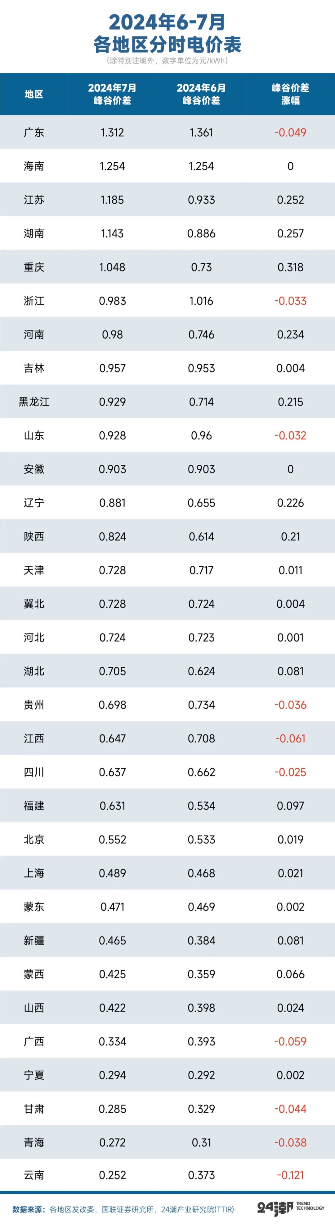 这并非危言耸听,根据东海证券统计,今年以来浙江、河南、江苏多地发布分时电价调整政策,全国范围内峰谷电价差缩窄趋势显著,河南省分时电价调整新政亦正式落地。从最新公布的6月全国代理购电价格来看,今年6月全国共计22个区域峰谷价差超0.6元/kWh(其中共14个区域最大峰谷价差超0.7元/kWh)、超7成区域峰谷价差同比下降。