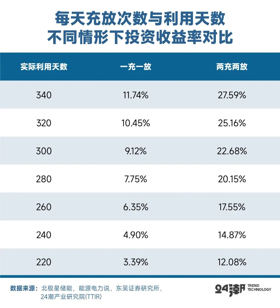 还需要注意的是,据东吴证券测算,工商储实际应用中收益率低于理论值,对工商业业主吸引力有限。工商储单个项目功率较大,初始投资成本约上千万元,此外分时电价政策变化的不确定性、若实际利用天数较低,收益率将打较大折扣,每天同一充放次数下,220天利用天数与340天利用天数可产生近2倍收益率差异。考虑目前实际利用是一充一放为主,280利用天数下IRR为7.75%。