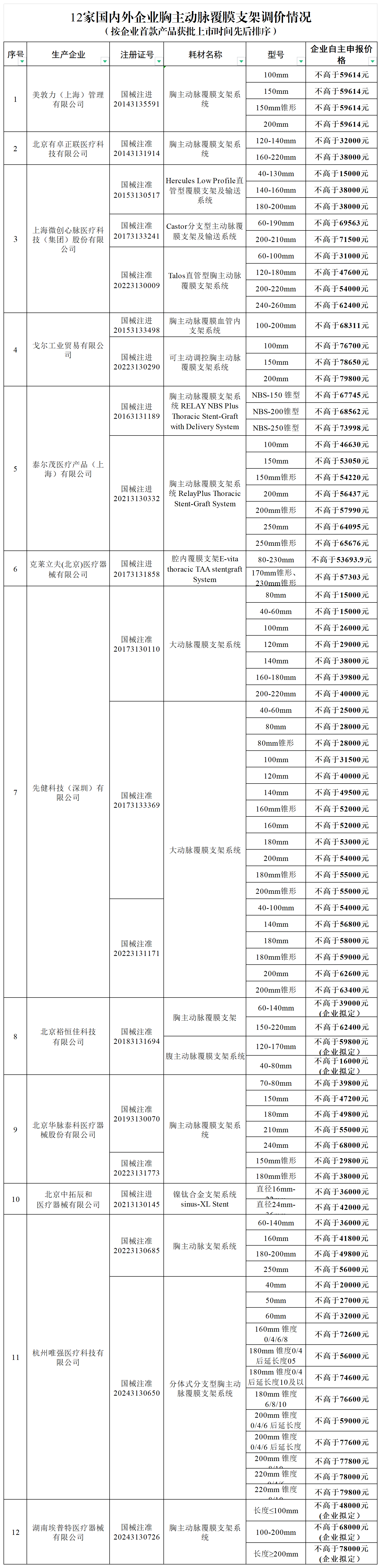 8月26日,据国家医保局消息,包括美敦力(上海)管理有限公司、北京有卓正联医疗科技有限公司、上海微创心脉医疗科技(集团)股份有限公司、戈尔工业贸易有限公司、泰尔茂医疗产品(上海)有限公司、克莱立夫(北京)医疗器械有限公司、先健科技(深圳)有限公司、北京裕恒佳科技有限公司、北京华脉泰科医疗器械股份有限公司、北京中拓辰和医疗器械有限公司、杭州唯强医疗科技有限公司、湖南艾普特医疗器械有限公司在内的12家国内外医疗器械公司重新调整了胸主动脉覆膜支架的价格。