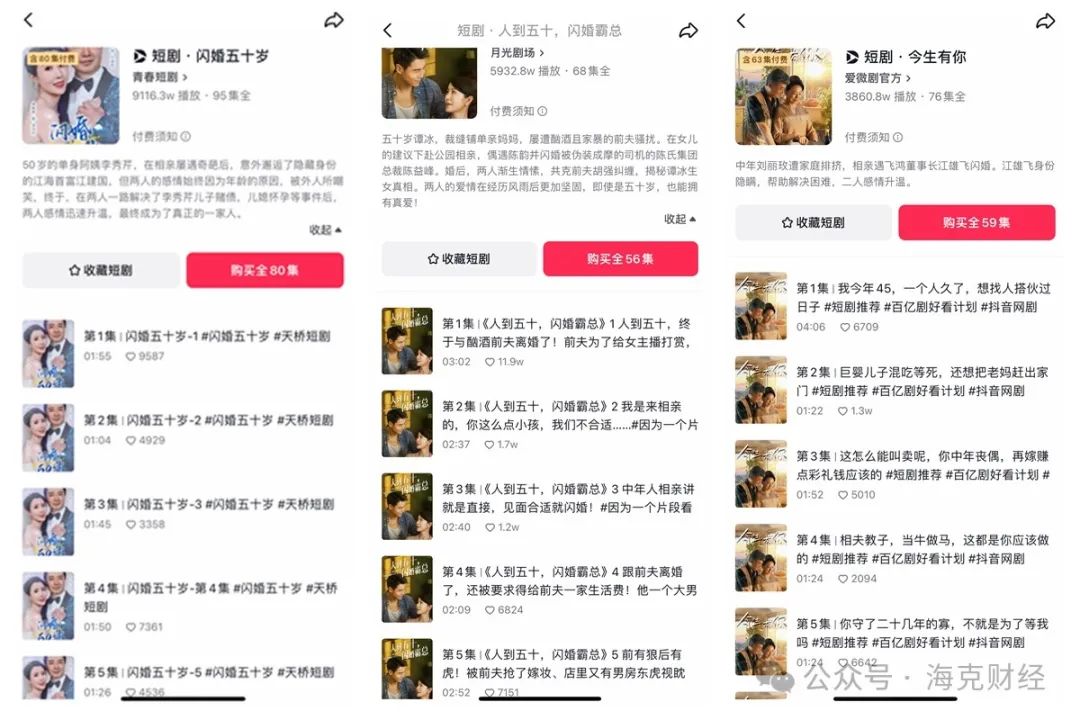 比如热度居高的《闪婚五十岁》,讲述作为集团总裁的50岁男主角与45岁女主角闪婚后的爱情故事。这部剧集抖音相关话题播放量达4.7亿次,大结局相关话题播放量达1.1亿次;快手相关话题播放量约6000万次,平台统计有27.4万用户喜欢。类似剧集还有《人到五十,闪婚霸总》《今生有你》等。
