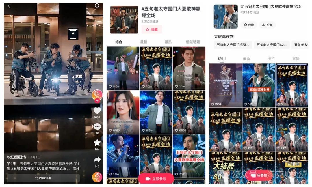 如《五旬老太守国门大夏歌神赢爆全场》(以下简称《大夏歌神》)就颇具热度。《大夏歌神》剧集共91集,每集时长2-4分钟,以“大夏”的中外歌唱比赛开头,提及歌坛一位“五旬天后”力战不敌,以“歌坛无人”塑造冲突。剧情主线是知名歌手林天王在对战国外歌手时猝死,“魂穿”到代驾司机林阳身上,要借林阳年轻的身体重新赢得比赛,成为“大夏歌神”。《大夏歌神》相关话题在抖音播放量达2.3亿次,在快手播放量约4300万。