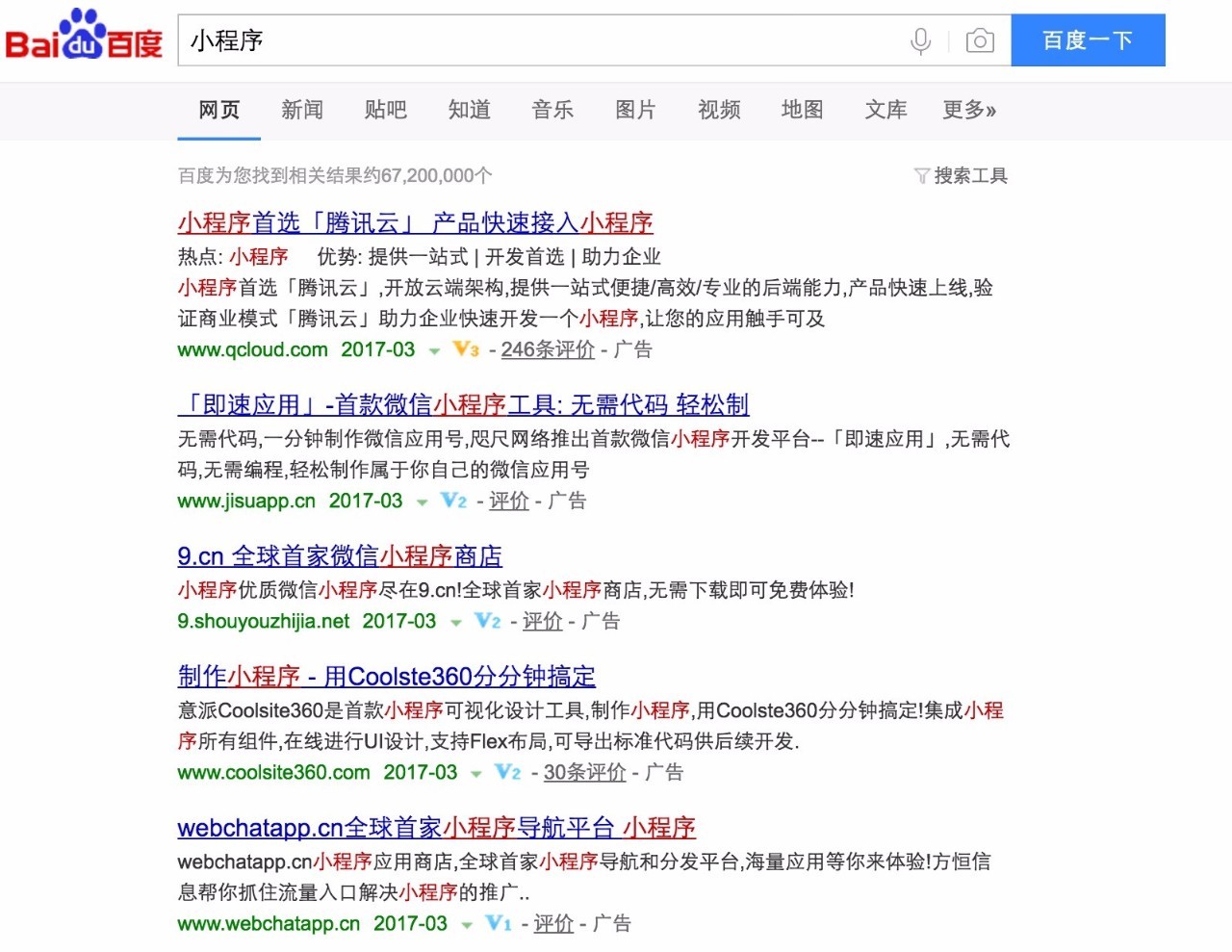 有意思的是,新零售路上小编在百度搜“小程序”,首屏会出现多个关于小程序搭建、运营、推荐的广告,小程序生态的热度已经超过小程序。