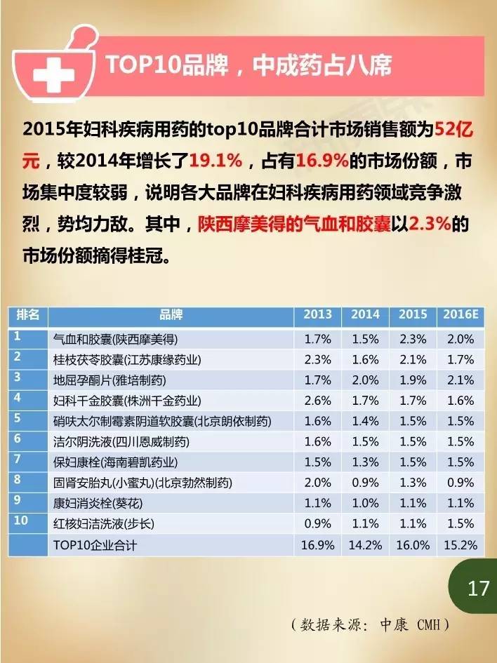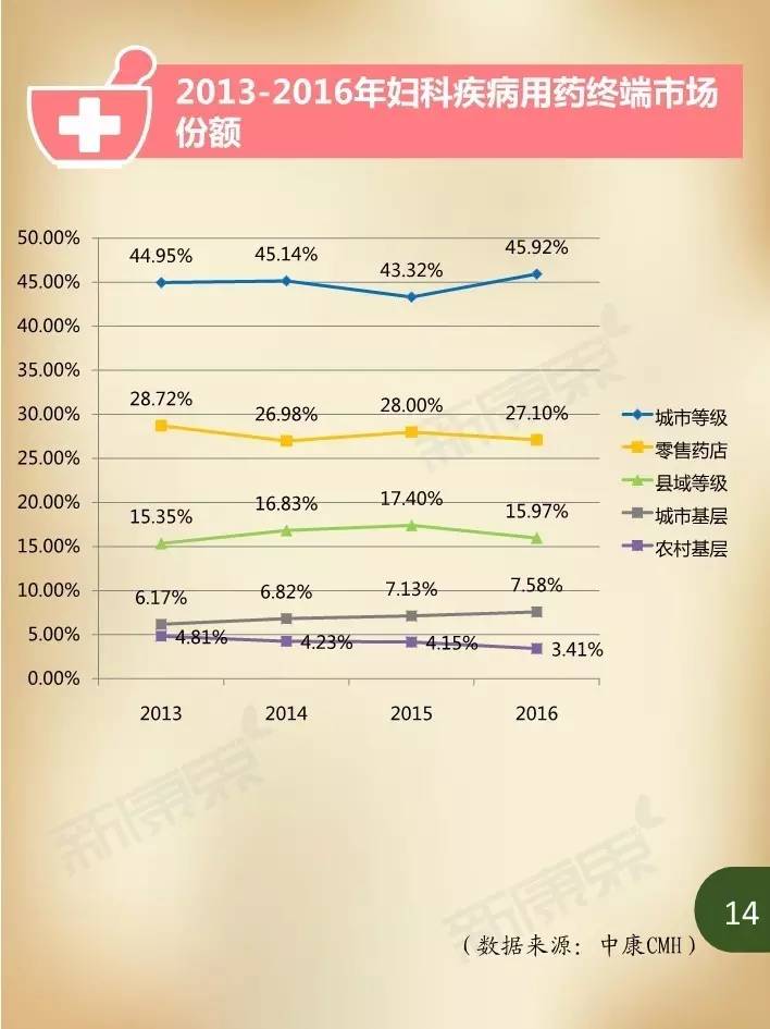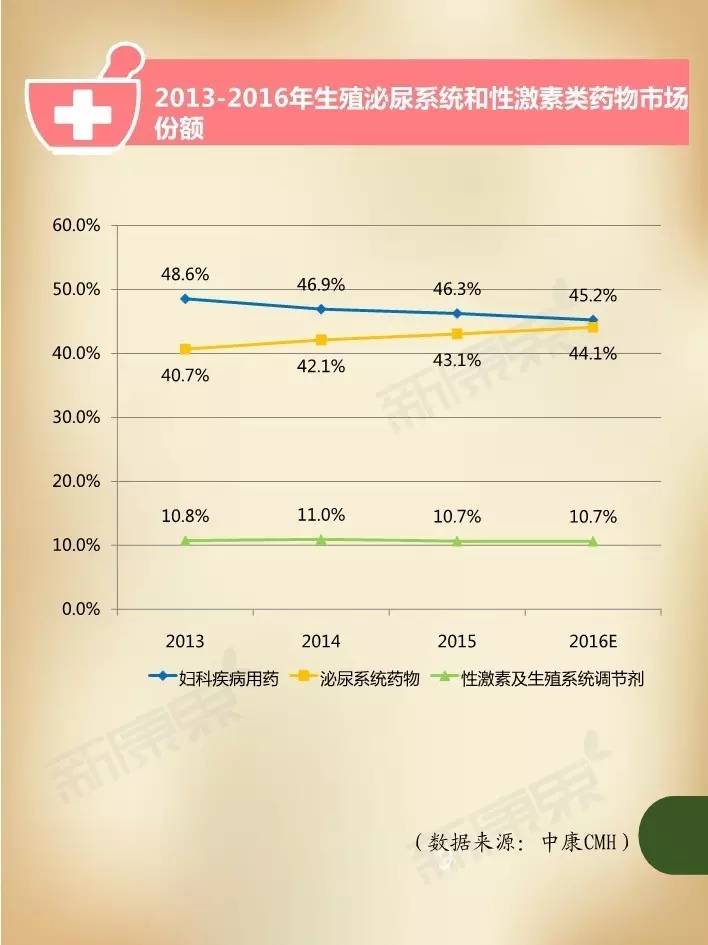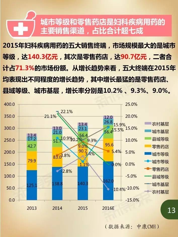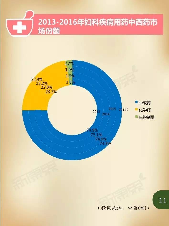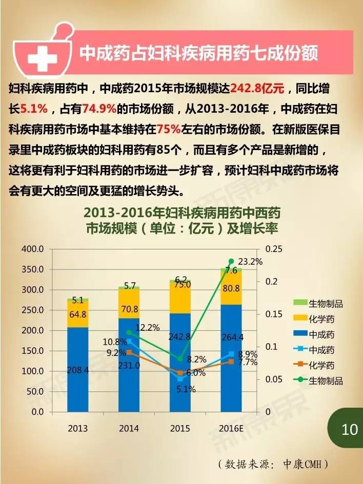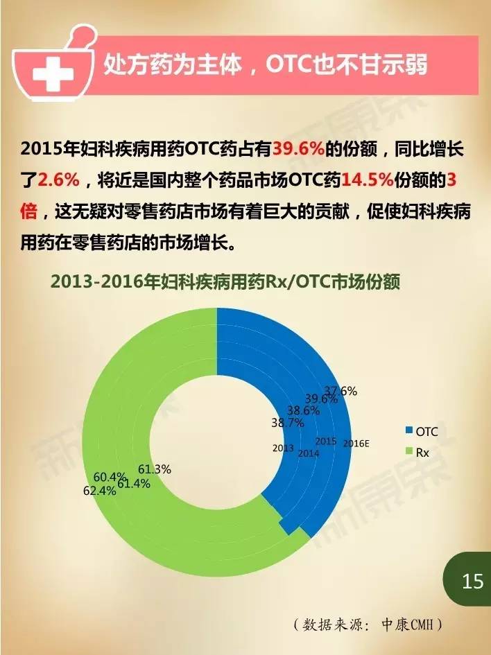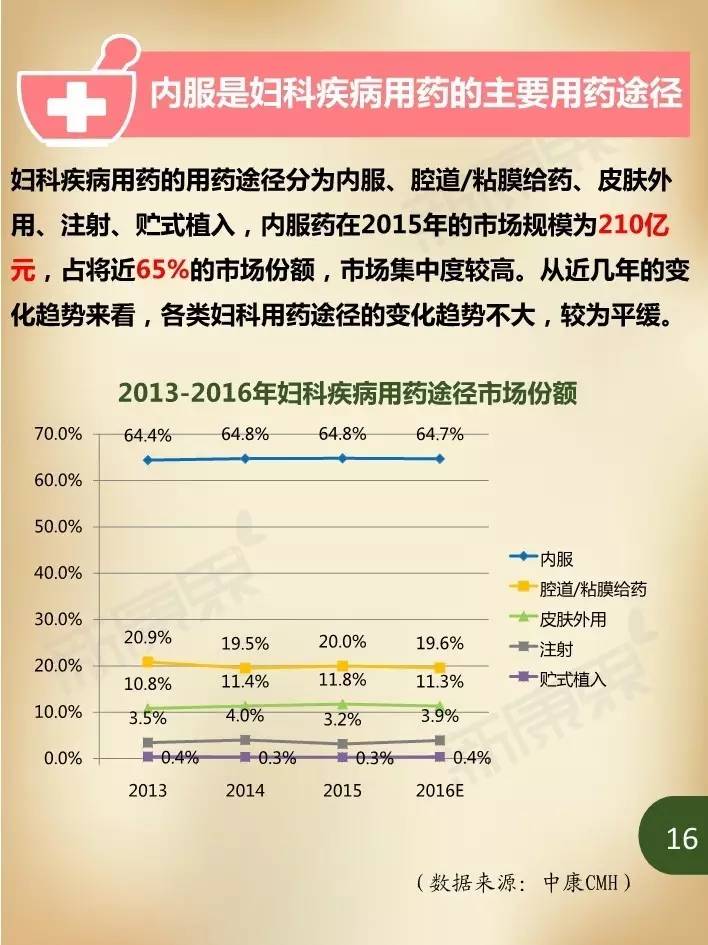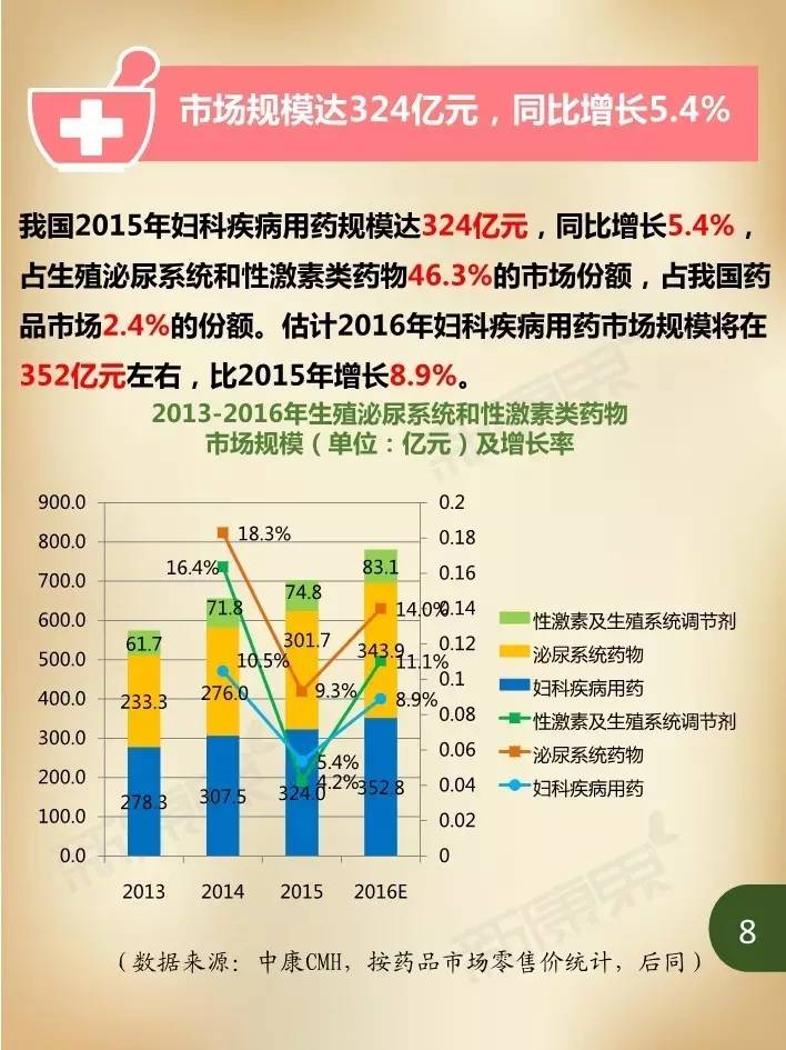 近年来,在我国妇女人口持续增加、妇科疾病患病率居高不下,以及大众健康意识不断提升等诸多因素影响下,国内妇科疾病用药市场规模持续保持高速增长。据中康CMH数据显示,我国2015年妇科疾病用药规模达324亿元,同比增长5.4%,占生殖泌尿系统和性激素类药物46.3%的市场份额,占我国药品市场2.4%的份额。估计2016年妇科疾病用药市场规模将在352亿元左右,比2015年增长8.9%。