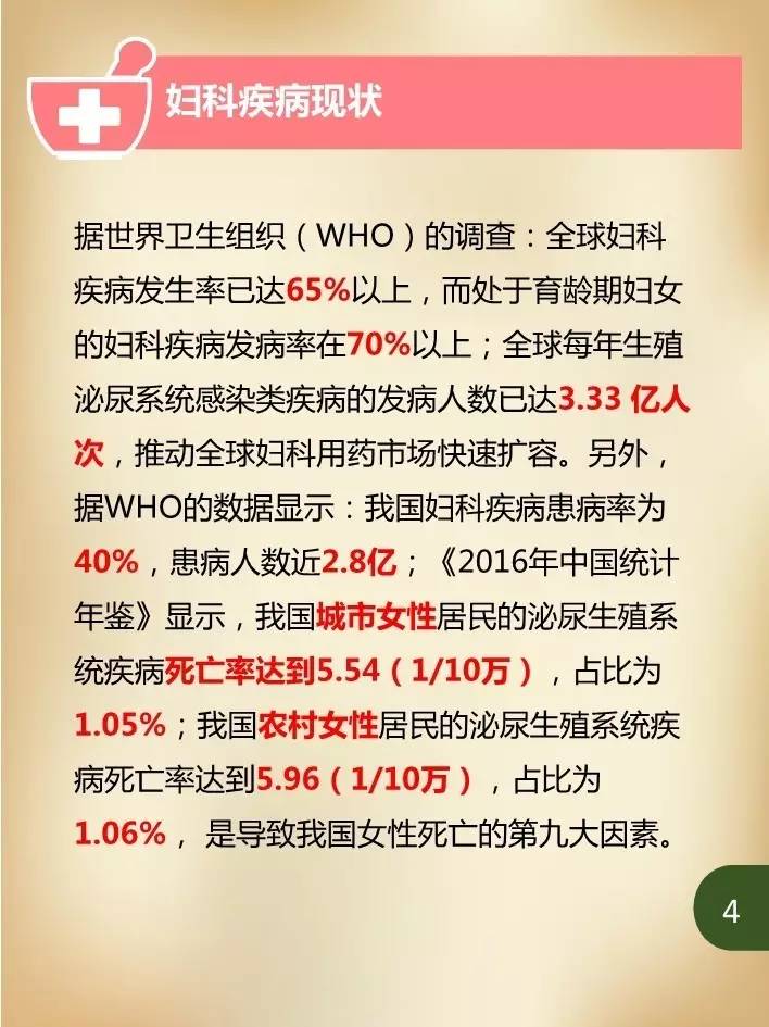 中国是世界上人口最多的国家,中国妇女占世界妇女人口近五分之一。WHO公布的数据显示:我国妇科疾病患病率为40%,患病人数近2.8亿。另外,《2016年中国统计年鉴》显示我国城市女性居民的泌尿生殖系统疾病死亡率达到5.54(1/10万),占比为1.05%;我国农村女性居民的泌尿生殖系统疾病死亡率达到5.96(1/10万),占比为1.06%,是导致我国女性死亡的第九大因素。