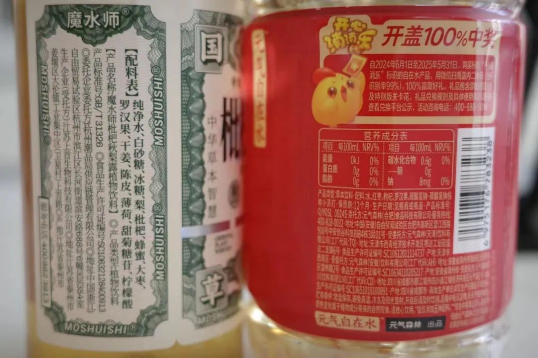 我们在便利店里对比了元气森林的元气自在水和魔水师的枇杷秋梨露饮料。前者的配料表除了水,只有红枣、枸杞、罗汉果和小苏打,而后者的配料表里,水排第一,第二、第三分别是白砂糖、冰糖,再往后,才是梨、枇杷等养生食材。