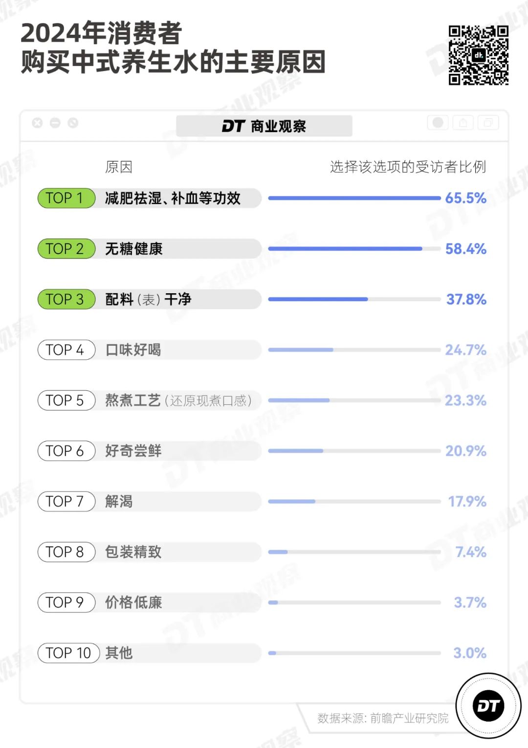 《前瞻产业研究院》曾调研消费者购买中式养生水的原因,排在第一位的就是“减肥祛湿、补血等功效”(65.5%)。