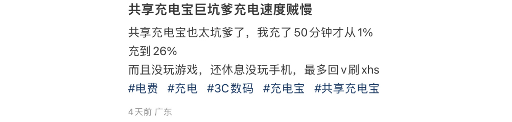 被吐槽最多的一点,估计就是“充电慢”了。有消费者吐槽称,“充了50分钟,才从1%充到26%”。这背后,部分因素是有些共享充电宝技术更新迭代慢或设备老旧,也有传言称,一些厂商甚至会专门调整充电功率以延长用户使用时间。