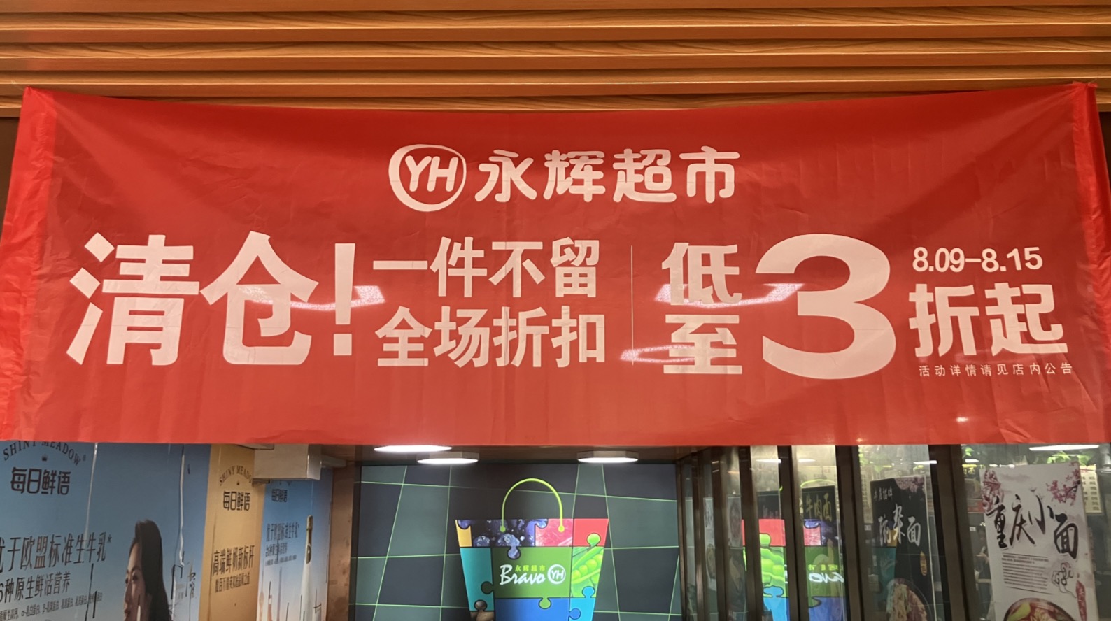 8月中旬,界面新闻走访了正在进行闭店甩卖的永辉北京将台路店,这家位于地下一层的门店面积不大,整个水产区域已经出清,部分制冷设备也已经关闭,所剩的食品、饮料、日用品货架上都贴着手写的价签,显得非常凌乱。