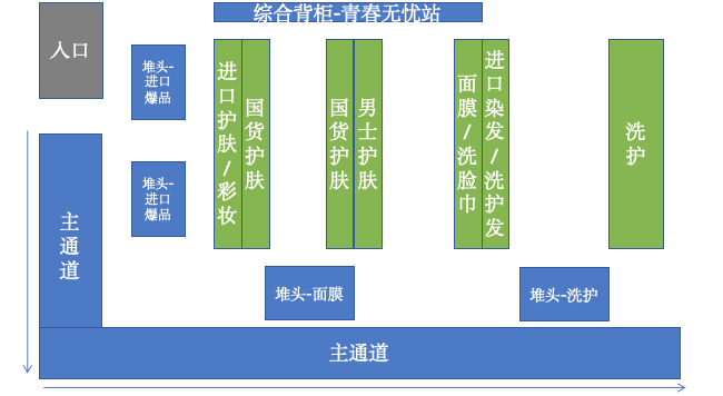 如原来超市主通道宽度在1.8米,现在拓展至3到4米,货架高度从1.8米降到了1.6米。此外,化妆品区域堆头数缩减至4个。化妆品背柜全部取消,仅新设一个名为“青春无忧站”的美妆个护综合背柜。
