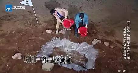 比如第四期节目中,六位兄弟要先接力把坑里的土用铲子给铲出来,然后再接力用桶装水把坑填满,最后大家再一个接着一个跳过去。