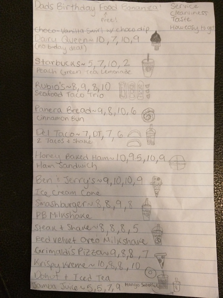 女儿一路记录,并且给每家店都打了分,项目包括服务质量、洁净程度、菜品味道和获取易度。来看看小萝莉最喜欢哪一款?