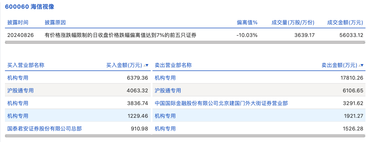 8月26日,海信视像今日跌停,龙虎榜数据显示,上榜营业部席位全天成交4.71亿元,占当日总成交金额比例为84.01%。其中,买入金额为1.64亿元,卖出金额为3.07亿元,合计净卖出1.42亿元。