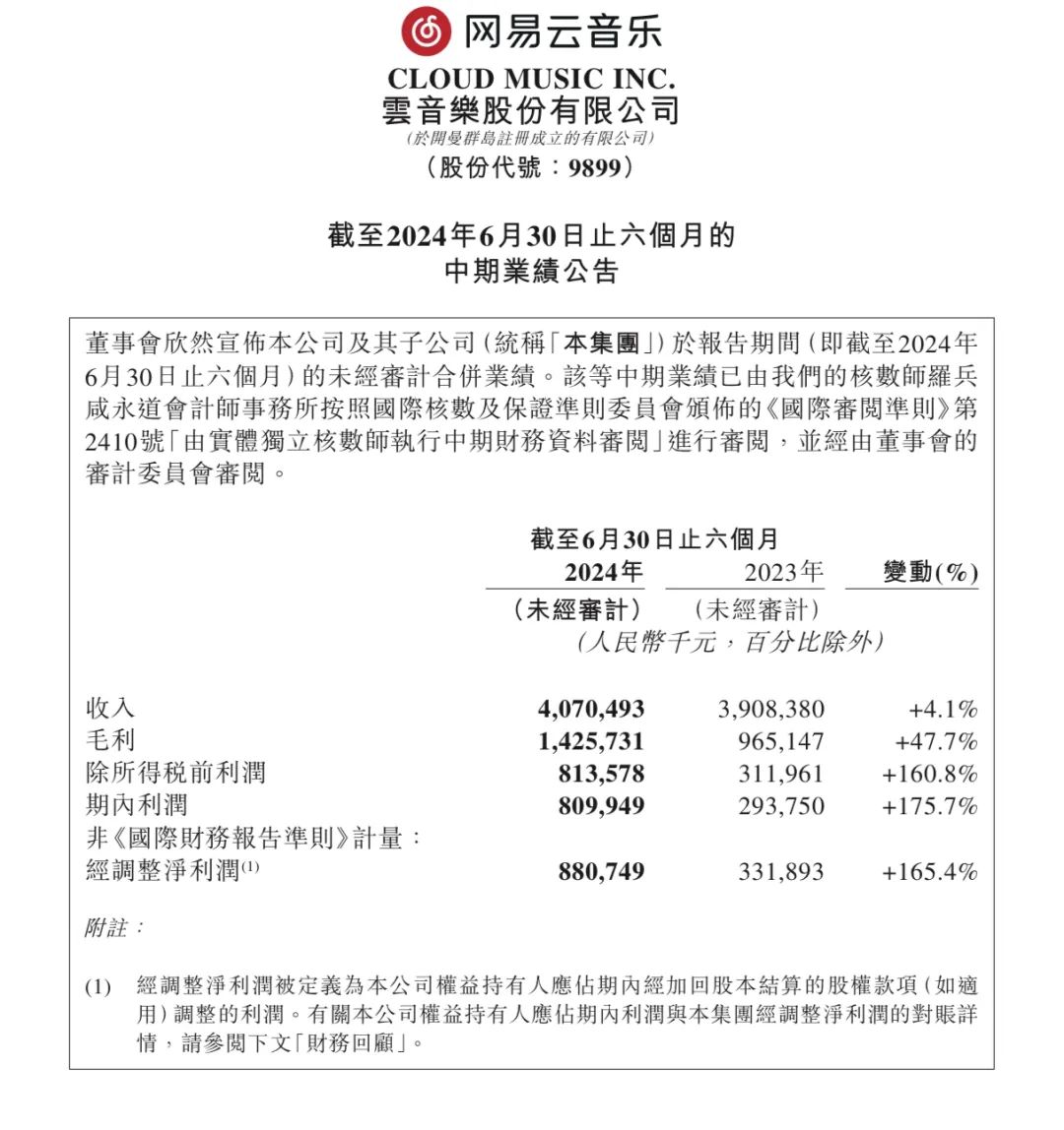 可令人玩味的是,业绩公告显示,网易云音乐上半年的营业与净利均实现同比增长,其中经调整净利润较去年同期更增长了165.4%,达8.8亿元。
