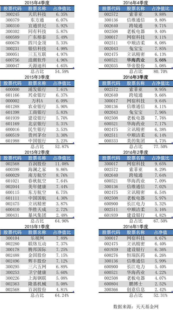 与淡化择时理念同步更新的,是精选个股的思路。从重仓股历史明细可以发现,持股名单日趋稳定,越来越多的股票在多期基金季报中连续曝光,从“一季一换”转向长期持有。其中立讯精密(002475.SZ)、华海药业(600521.SH)、老板电器(002508.SZ)、网宿科技(300017.SZ)、信维通信(300136.SZ)这5只已经被重仓持有一年以上。