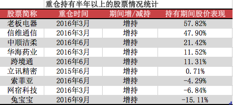 进一步梳理可发现,不错的成绩单来源于对部分个股的坚持。下表为该基金重仓持有至今半年以上的股票情况统计,其中股价计算起始日为季报披露时,终止日为2016年12月31日: