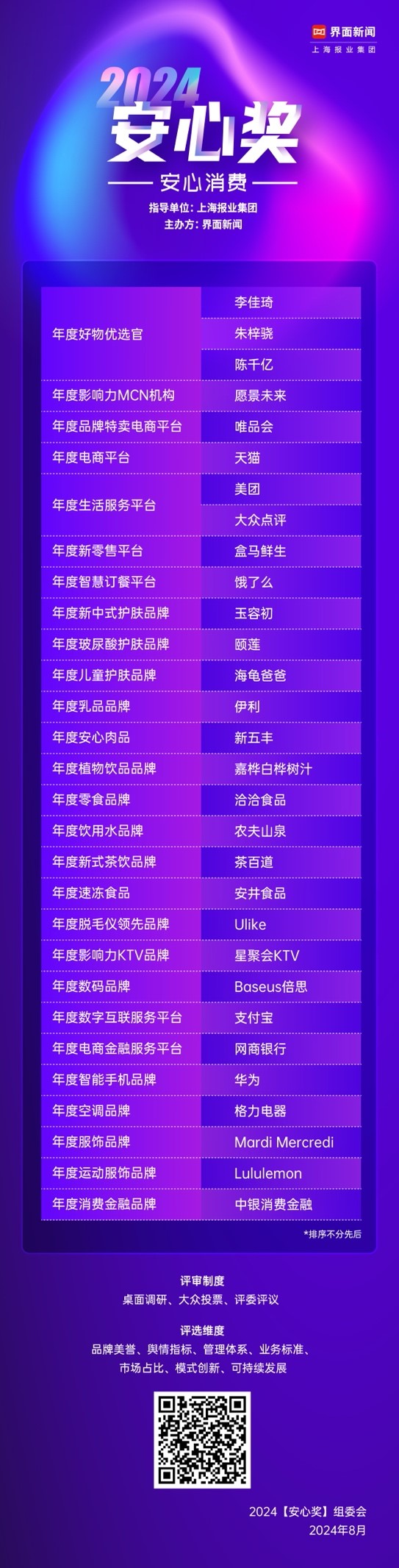 8月29日,上海报业集团|界面新闻主办的2024【新消费盛典】正式公布了本年度【2024安心奖】获奖名单。最终30个品牌突破重围荣登榜单,展现优秀品牌对中国消费领域发展所做的卓越贡献。