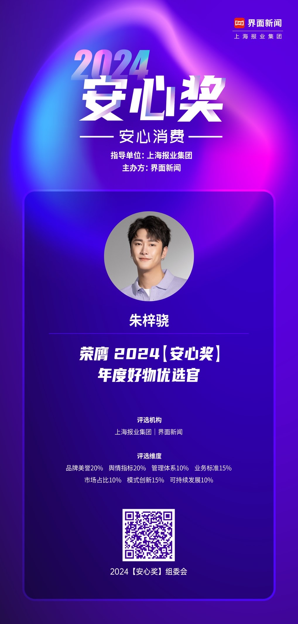 凭借巨大的商业价值和良好的消费者口碑,朱梓骁荣获本届【新消费盛典】【2024安心奖】年度好物优选官。