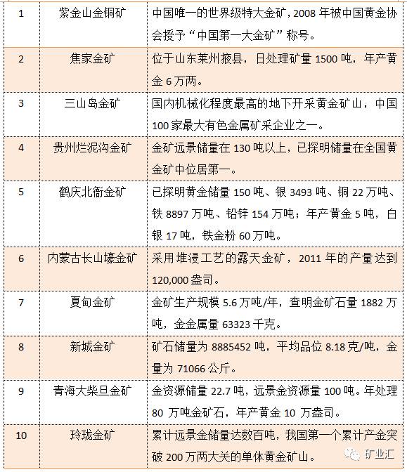 根据中国黄金协会2012年统计数字,从开采量和产量来看,目前排名前十位的中国十大金矿分别为: