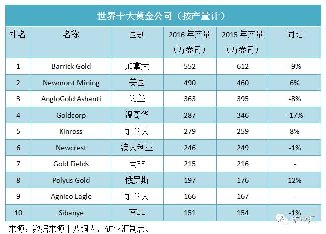 2016年,金价打破了连续三年的下跌趋势,但是以产量计的全球顶级金矿公司的关注点仍是削减成本和资产剥离(不同程度的成功),而这将导致大部分行业巨头的产量下降。