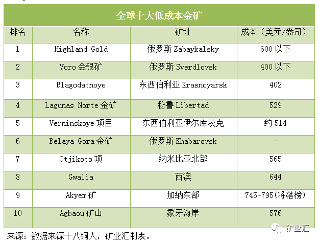 该排名是按每盎司完全可持续成本(all-in sustaining costs,AISC)进行比较,将许多管理费用的支出、矿山开发和持续勘探的持续性资本开支等内容纳入考量范围,而将黄金作为副产品的项目排除掉。