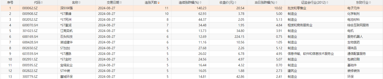 Choice数据统计,今日1只个股连续11天上涨,为深圳华强;1只个股连续10天上涨,为*ST景峰;此外,*ST同洲连续8天上涨;*ST富润连续7天上涨。