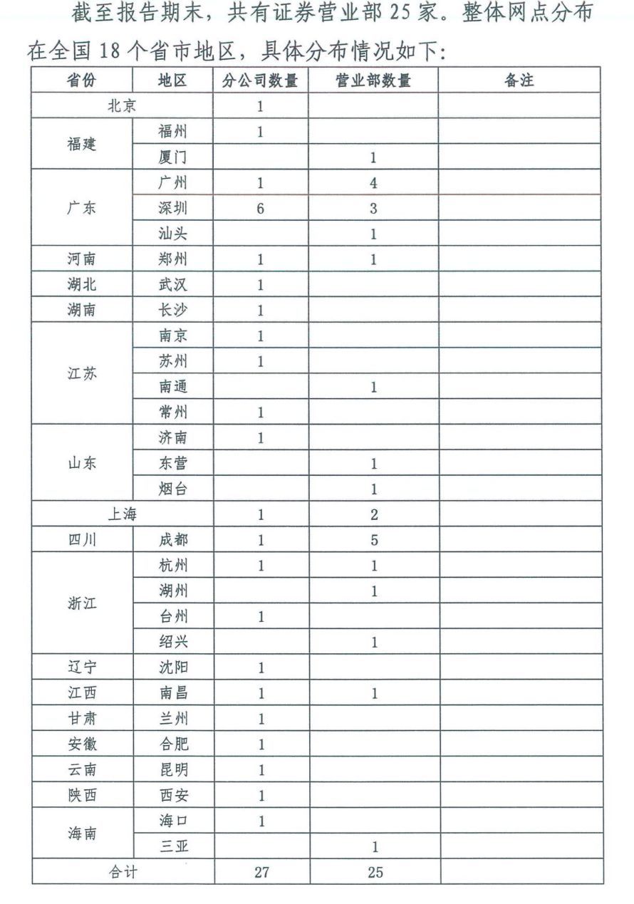 截至2024年6月末,国信证券拥有58家分公司,181家证券营业部;此外,营业网点261个,在珠三角市场的线下网点较密集,其中广东省有71个。