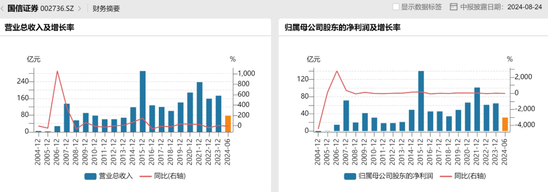 停牌次日,8月23日晚,国信证券披露了营收净利“双降”的半年报。据财报显示,2024年上半年,国信证券营业收入77.57亿元,同比减少5.49%;归母净利润31.39亿元,同比减少12.56%。
